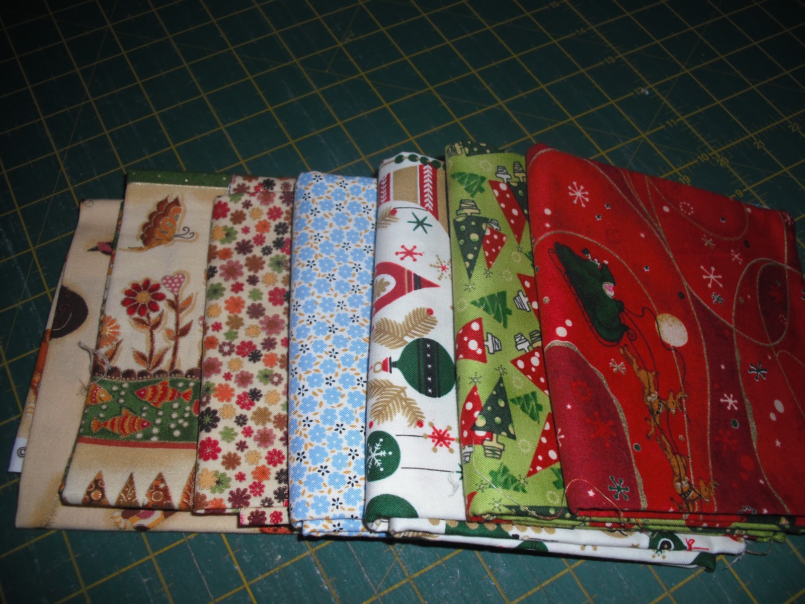 Some Christmas fabrics from Marg to make a table runner. The blue piece is for a bag & the others because i liked them.