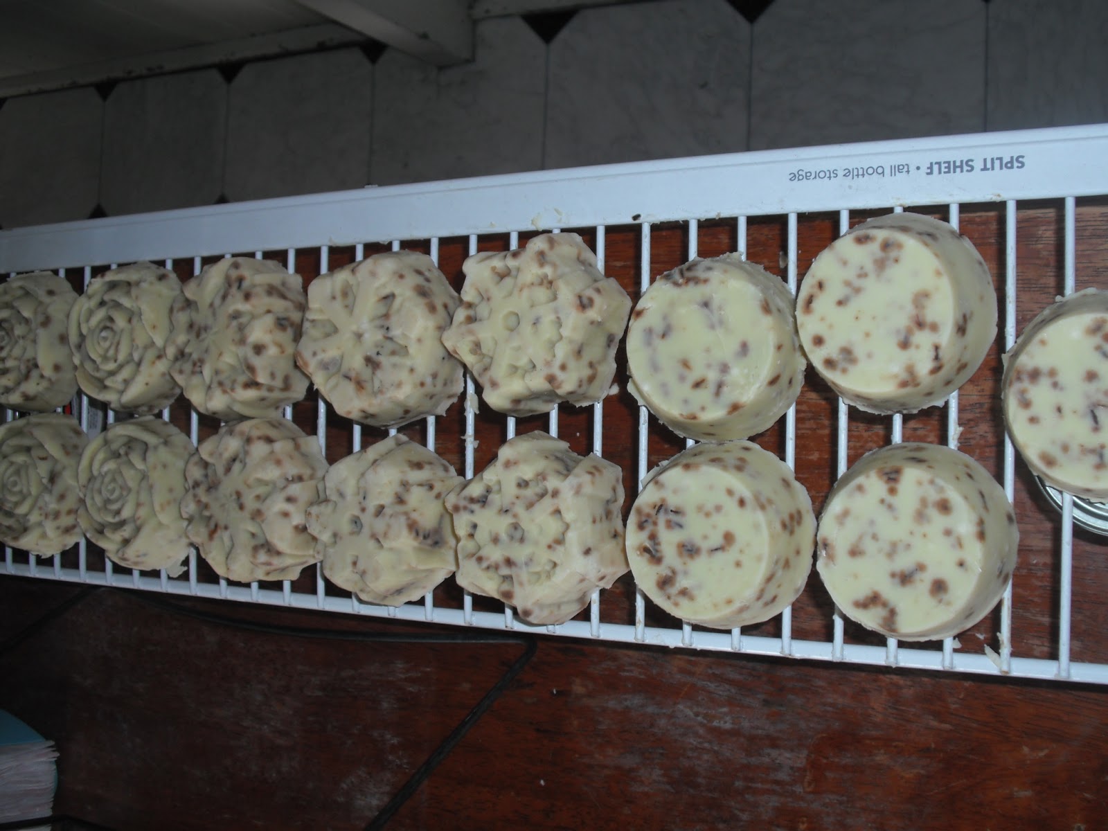 I filled these 4 bottles & half a small bottle. Next on my list was more soap. I'm not sure about this batch though. I've discovered that the colour of the olive oil affects the colour of the soap. This time i added dried lavender. They are all the brown spots you can see. Maybe the rainy weather is also affecting the soap as they seem to be softer than last batch. Hopefully they'll have become a little harder in 4 weeks time when i can use them.