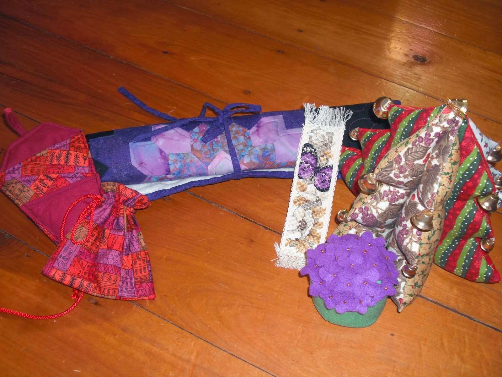 in the sack i found a holder for my scissors & little matching bag, a block roll, cross-stitch book mark, cute pincushion done in felt & a stuffed Christmas tree.
