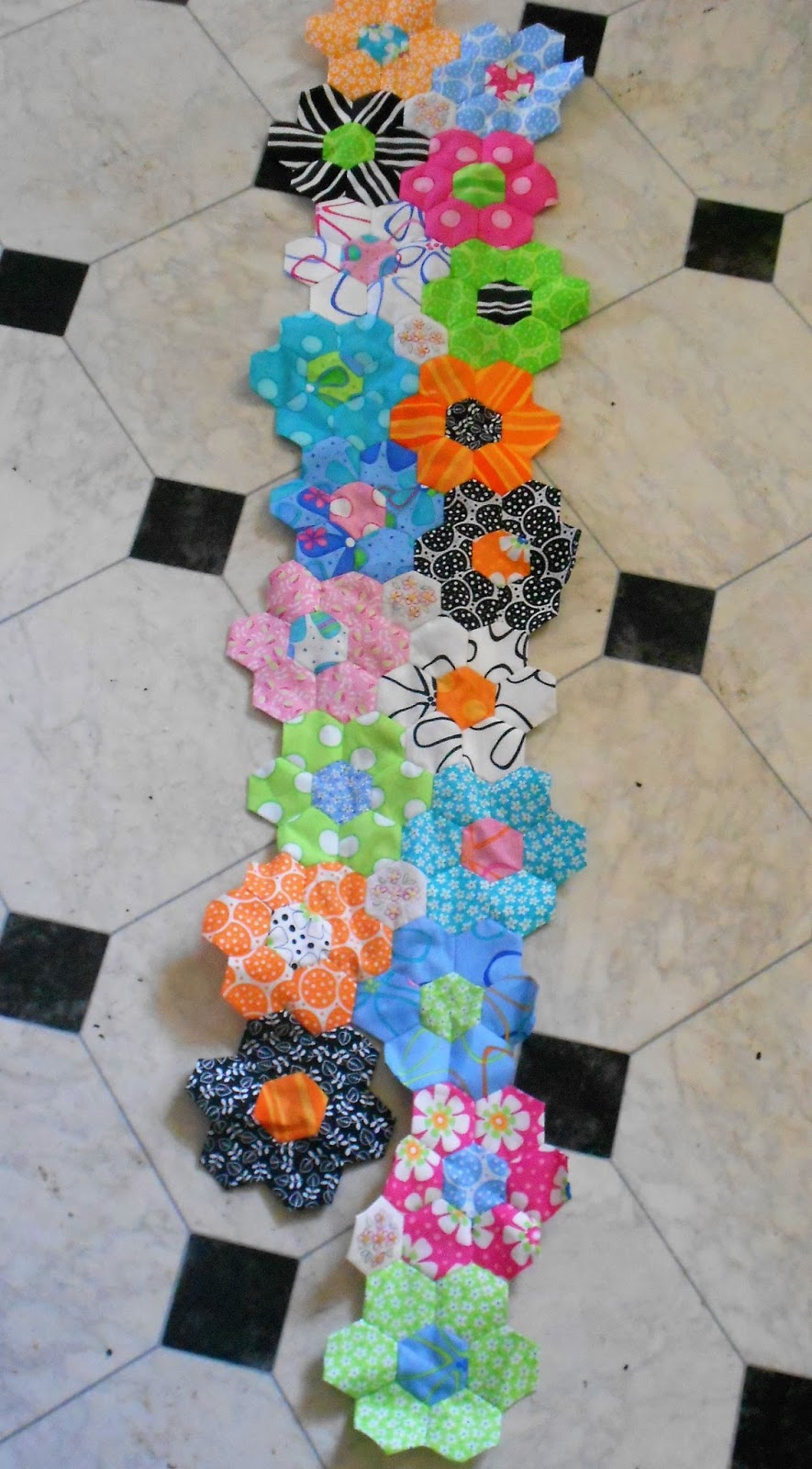 It is slow sewing on the hexagon quilt as they are a little awkward to sew together this way. All the papers that have been left in are getting all scrunched up. Nothing a good iron won't fix. I use the gluing method for the hexagons & have found that the paper unfortunately sticks to well to the fashion fuse i use behind the embroidery. So far i've only had one paper stick hard in the embroidered ones that tore to pieces. Hopefully it will be the only one. Not that i'm short on 1" papers. :)