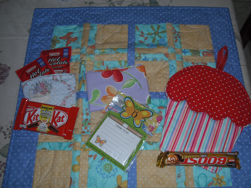 a beautiful table topper, cupcake potholder - so cute, wrap for my coffee mug, a fat 1/4, notepad with pencil, sachets of hot chocolate & yummy choccies. Thanks Joy for the lovely gifts. oooo can't wait to the next swap. It's for Christmas. :)