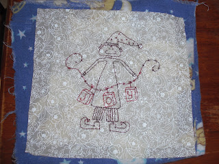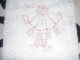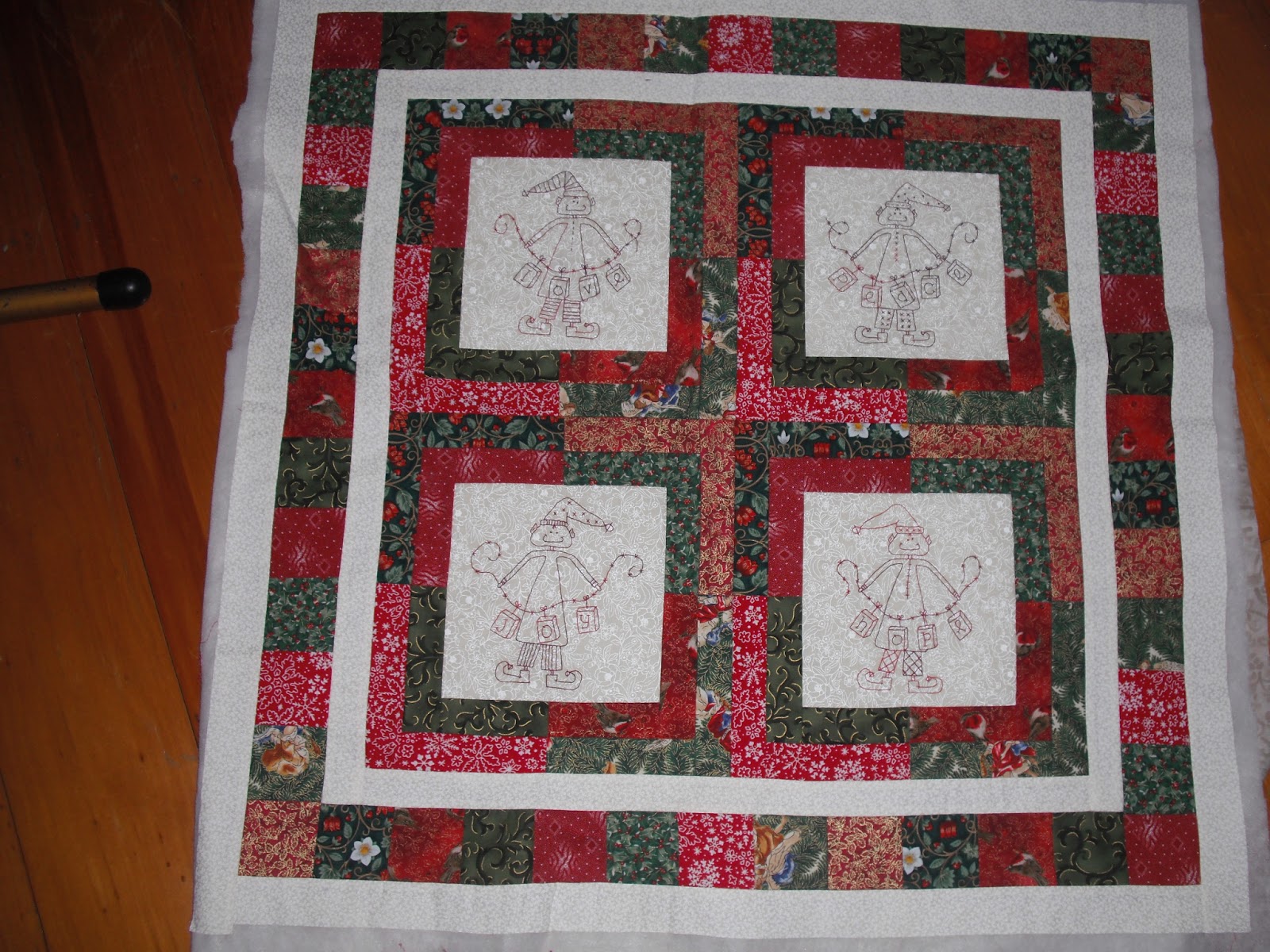 My day started early. I had stitcheries finished last month from a Gail Pan Christmas pattern that i didn't get back to sewing together. All the strips had been cut out as well. Yesterday was the day i decided. Plans didn't quite get fulfilled though. Some reverse stitching delayed completion. I did get it finished though, to the stage where all i need to do is quilt it, before i left for school pick up.