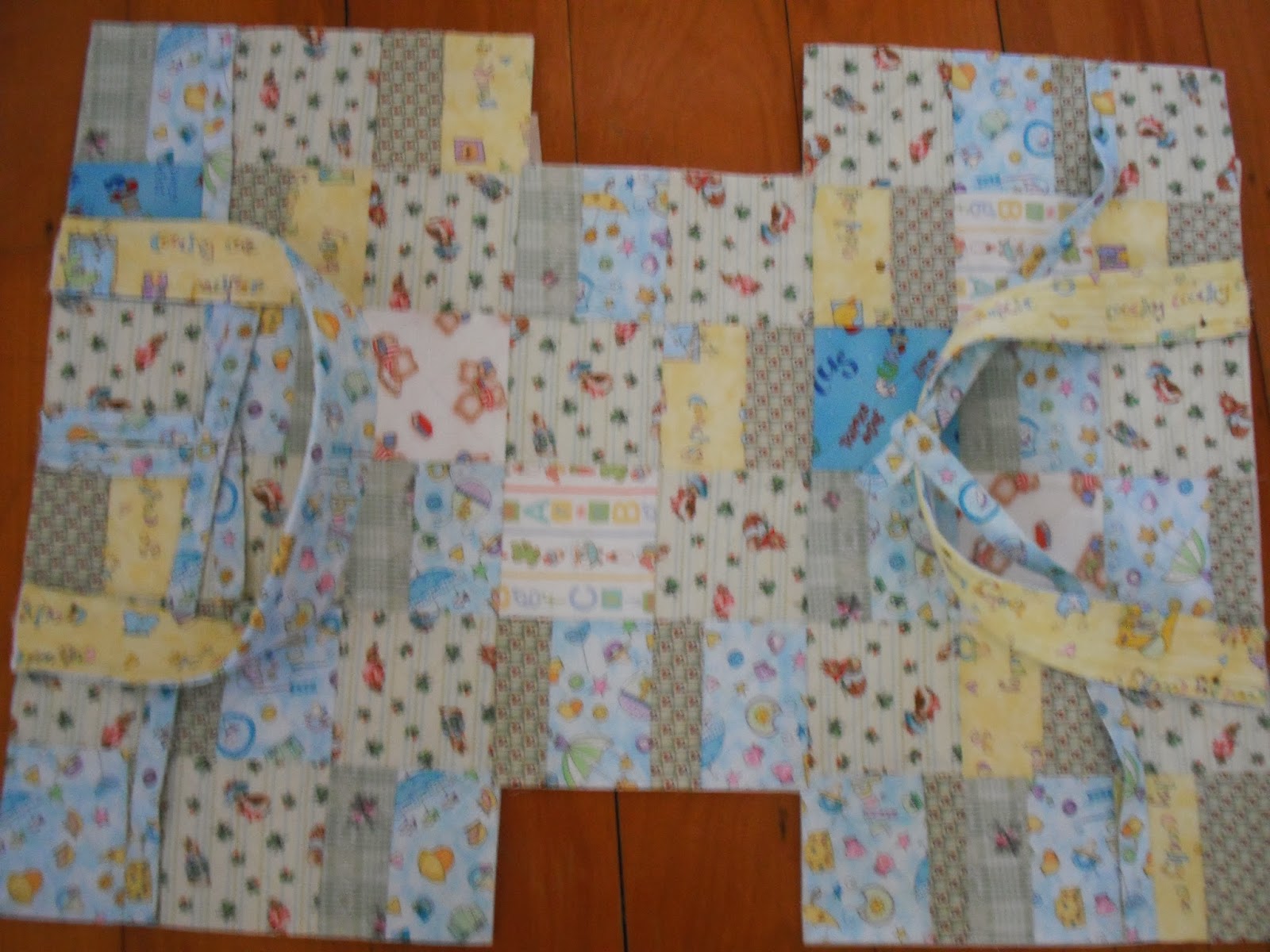 Then onto making a nappy bag. I'd already cut fabrics out weeks ago for a nappy bag pattern i had but just couldn't seem to bring myself to make it. Last weekend some friends & i got talking about a big bag we'd made using charm squares & how another friend was making them smaller with 4" squares & it was mentioned about using the smaller size for a nappy bag. Weeellll light bulb moment. So with sewing the cut strips together & turning them in squares & a few bits of other baby prints i had enough fabrics for the 44 squares needed. I only got the front done, back at it today.