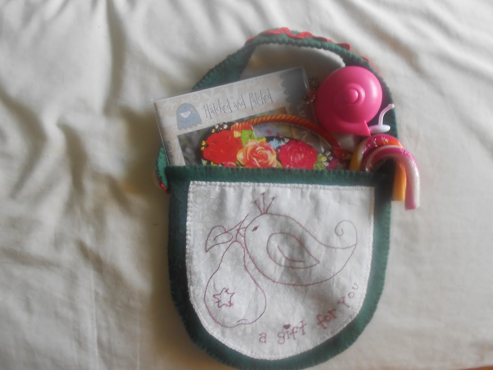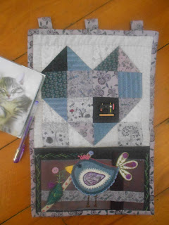 from Martina. I love it. The embroidery on the bird is fabulous. Behind the bird is a pocket which held the cute notepad & pen. Sorry for the crap photo. The purples look so much better in real life.